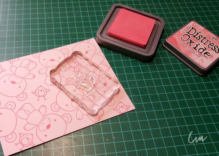 En las tarjetas rosas, el proceso que seguí fue muy simple. Elegí dos imágenes del set de sellos de My Favorite Things, Friends Furever,( Set de sellos de MFT, Friends Furever ) las coloqué en diferentes bloques de acrílico, y usando la tinta color Worn Lipstick de la nueva línea de tintas de Distress de Tim Holtz, Distress Oxide. ( Distress Oxide, Set 1 )