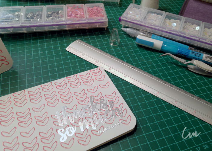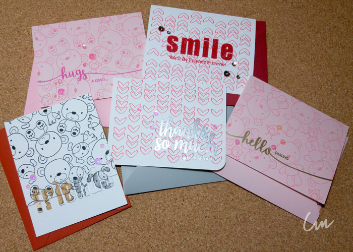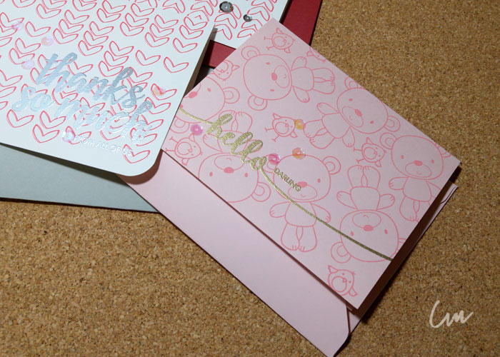 Por último le coloqué algo de brillo usando unas lentejuelas, a algunas les redondee las esquinas e hice los sobres para cada tarjeta con la Envelope Punch Board de We R Memory Keppers ( Envelope Punch Board ) , con hojas de color de acuerdo a cada tarjeta. Y listo! tenemos listas nuestras tarjetas, y para agregar un detalle extra, podemos estampar alguna de las mismas imágenes que usamos, en la solapa o al frente del sobre e incluso embosarla al igual que los mensajes.