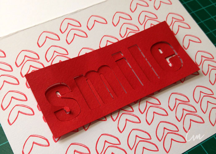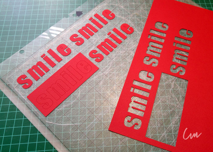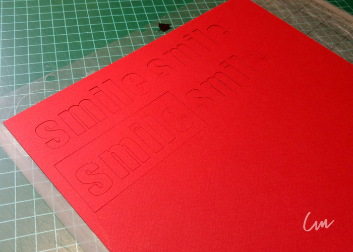 Y en las tarjetas con los detalles en rojo, utilicé la Silhouette Cameo, ( Silhouette Cameo ) con la base para colocar una pluma en el lugar de la navaja. Después en papel de color rojo, corte con la misma Silhouette la palabra SMILE, como se ve en una de las imágenes, hice varios cortes de la misma palabra. Esto con el propósito de pegar varias veces la misma letra, una sobre otra, para que tengan mayor relieve y realce sea mayor.